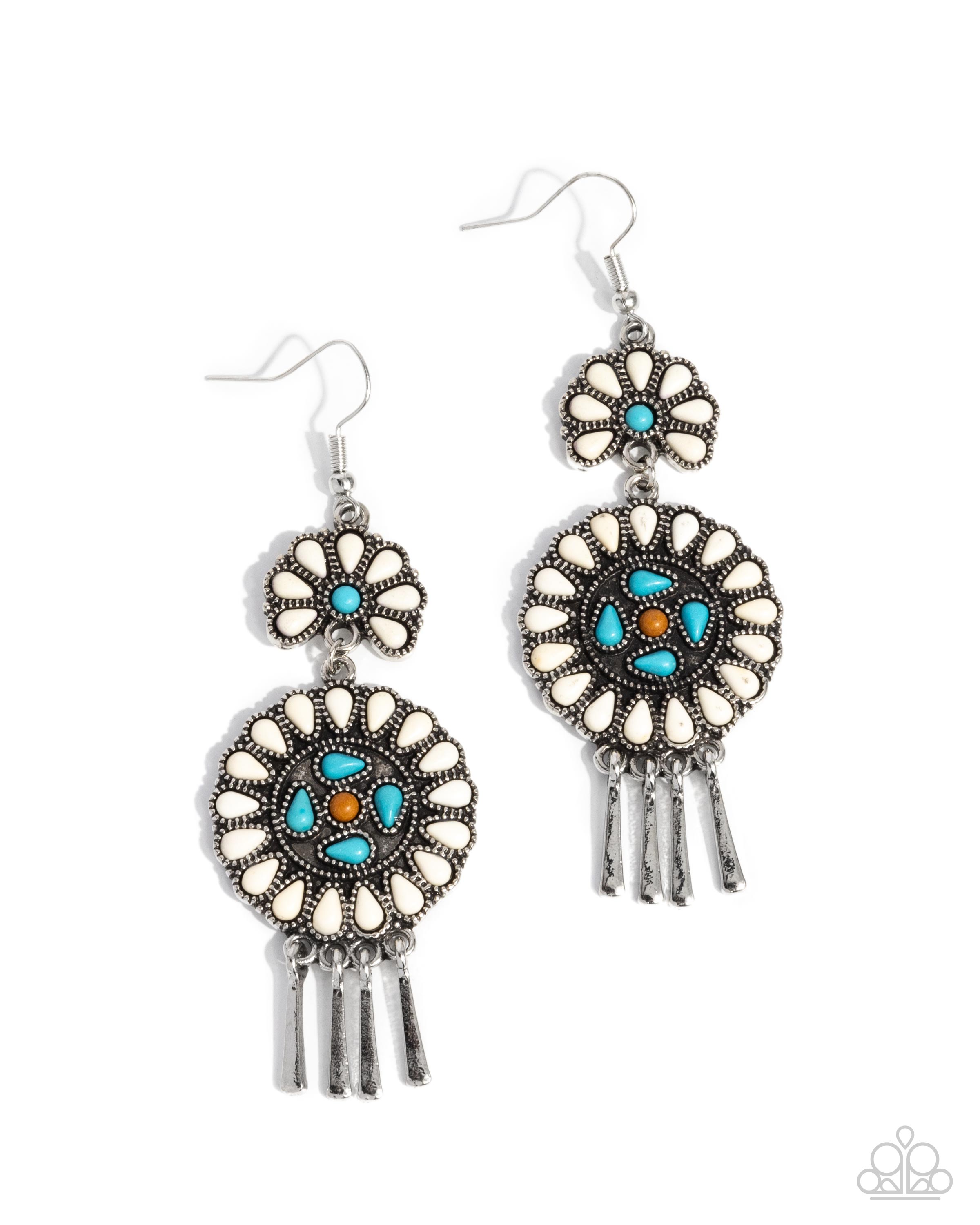 Pressed in a silver-studded frame, a collection of turquoise and white teardrop stones and round Buckthorn Brown stones create a half-floral frame giving way to a full floral pendant which then gives way to a quartet of tapered silver bars for an all-natural-trendy-lure. Earring attaches to a standard fishhook fitting. As the stone elements in this piece are natural, some color variation is normal.