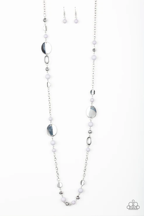 An array of polished gray beads, silver discs, and ornate silver accents trickles along a shimmery silver chain for a whimsical look. Features an adjustable clasp closure.