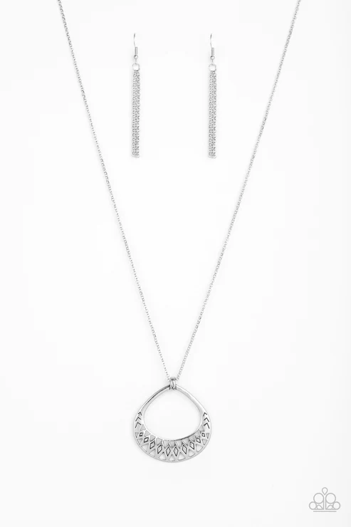 A textured silver teardrop pendant swings from the bottom of a lengthened silver chain for a funky tribal look. Features an adjustable clasp closure.