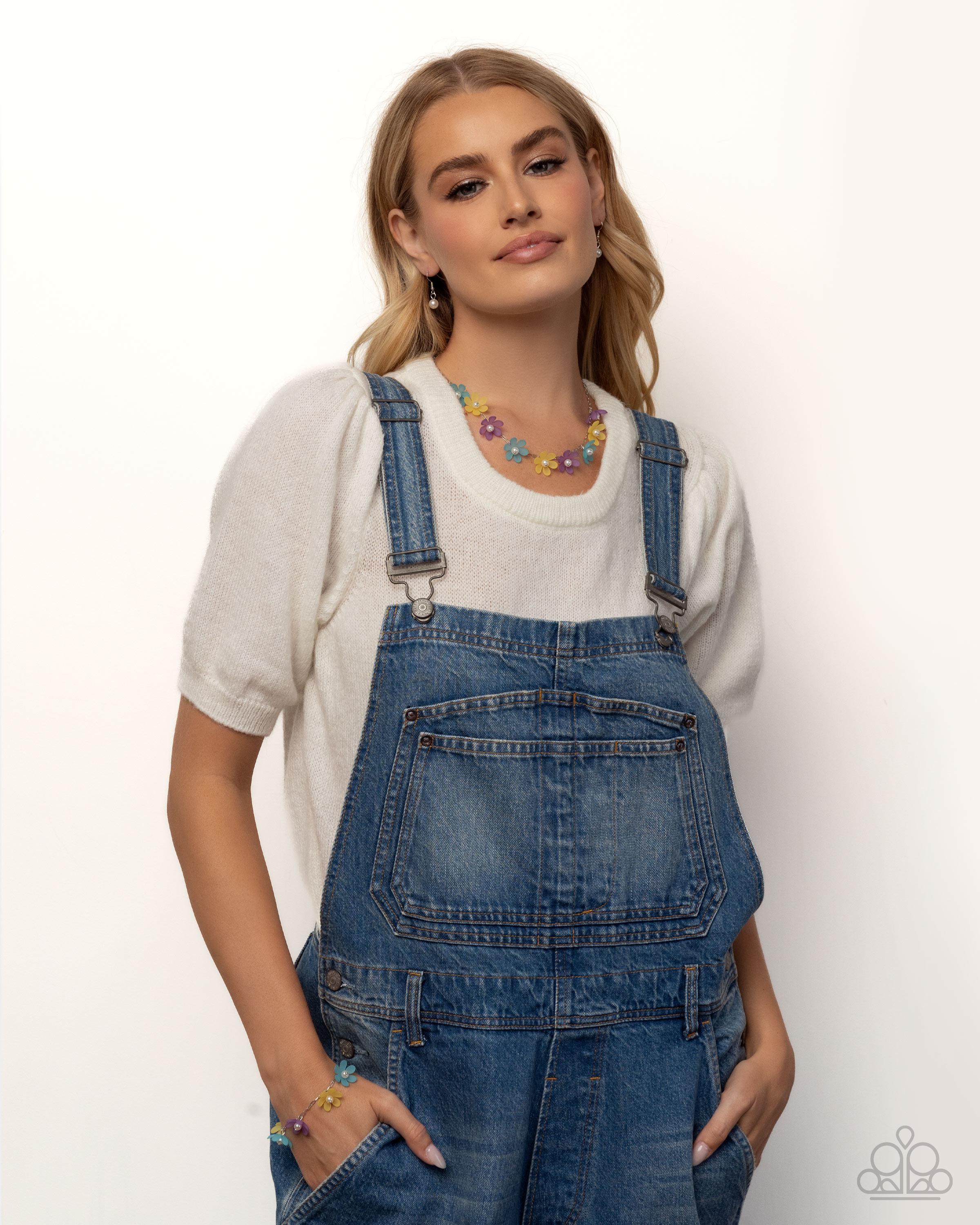 Dotted with white pearly centers, dainty sea glass-like turquoise, yellow, and purple flowers bloom across a dainty silver paperclip chain along the collar, invoking a festive spirit. Features an adjustable clasp closure.