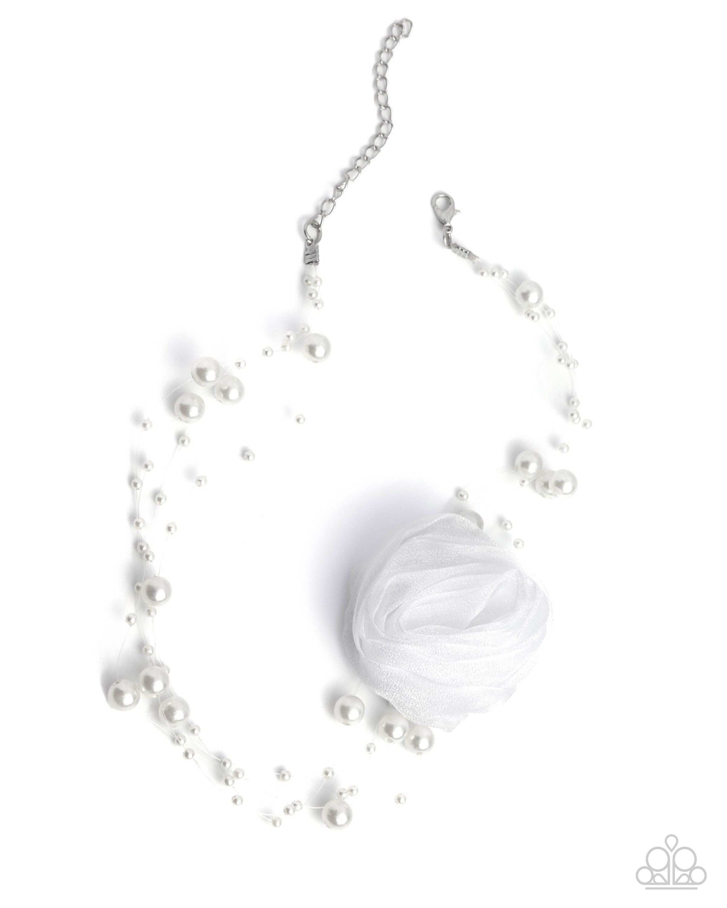 Infused along copious, dainty invisible wires, an exaggerated display of white pearls in varying sizes elegantly sweeps below the collar. A sparkly white tulle rose blooms along the center of the regal piece, adding over-the-top whimsicality to the unapologetic pearl palette. Features an adjustable clasp closure.