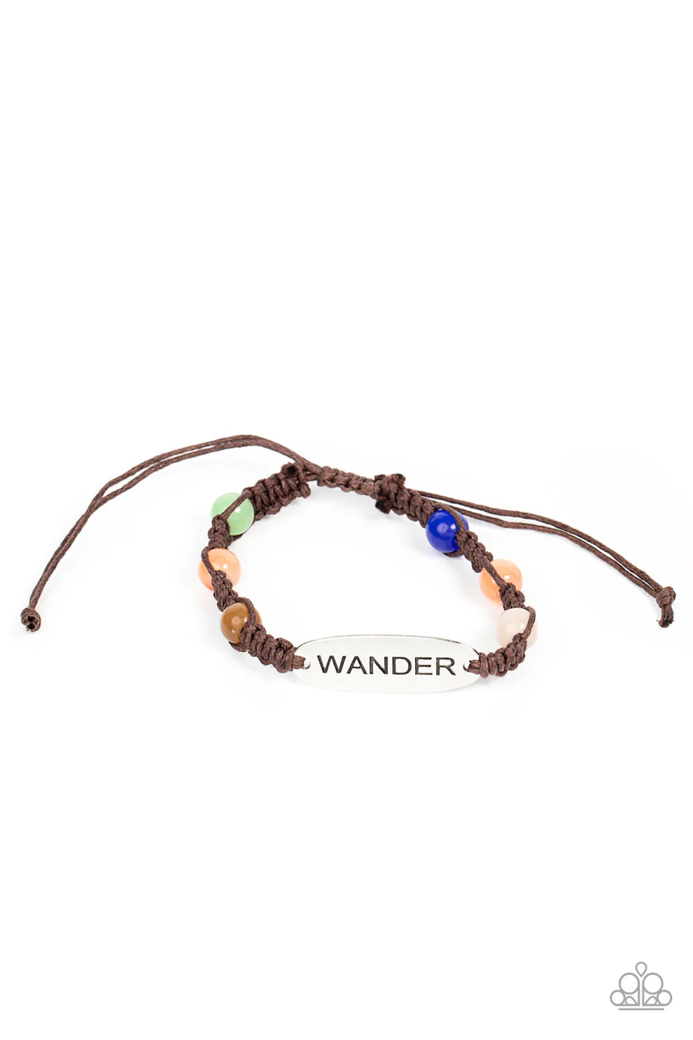 Glassy multicolored cat's eye stone beads are knotted in place along a strand of braided brown cording that attaches to a silver centerpiece stamped in the word, "Wander," for a free-spirited fashion. Features an adjustable sliding knot closure.