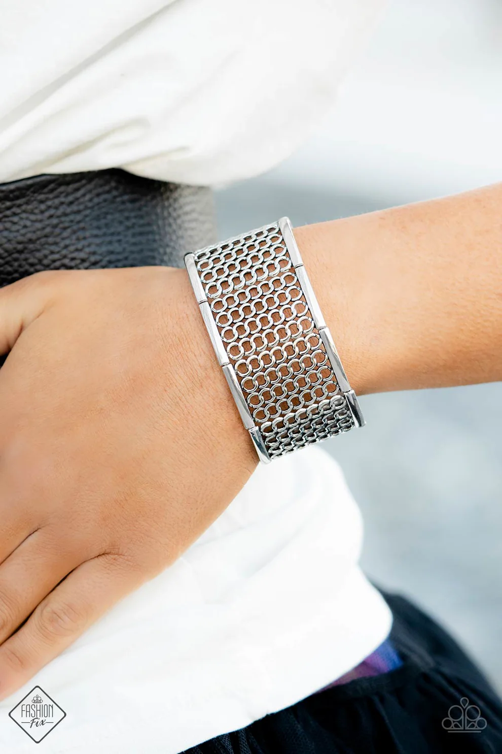 Oversized silver chain links are affixed between thick silver frames, linking together along stretchy bands to create the illusion of a solid bracelet that resembles chain mail armor.