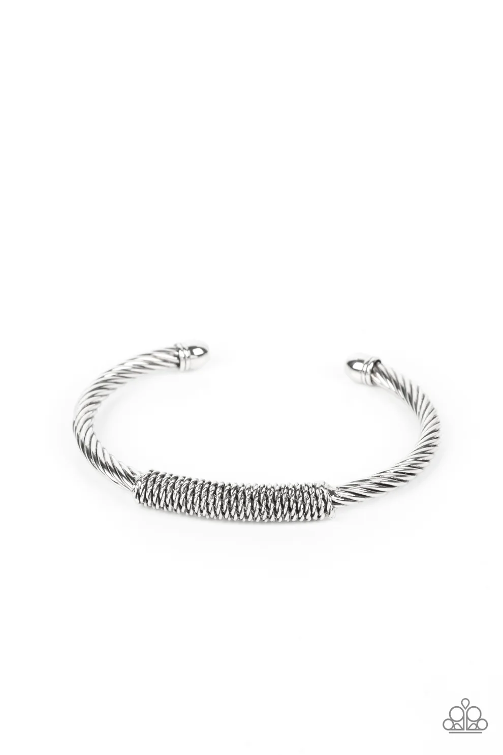 Twisted silver wire wraps around the center of a spun silver cuff, creating a rustic centerpiece around the wrist.