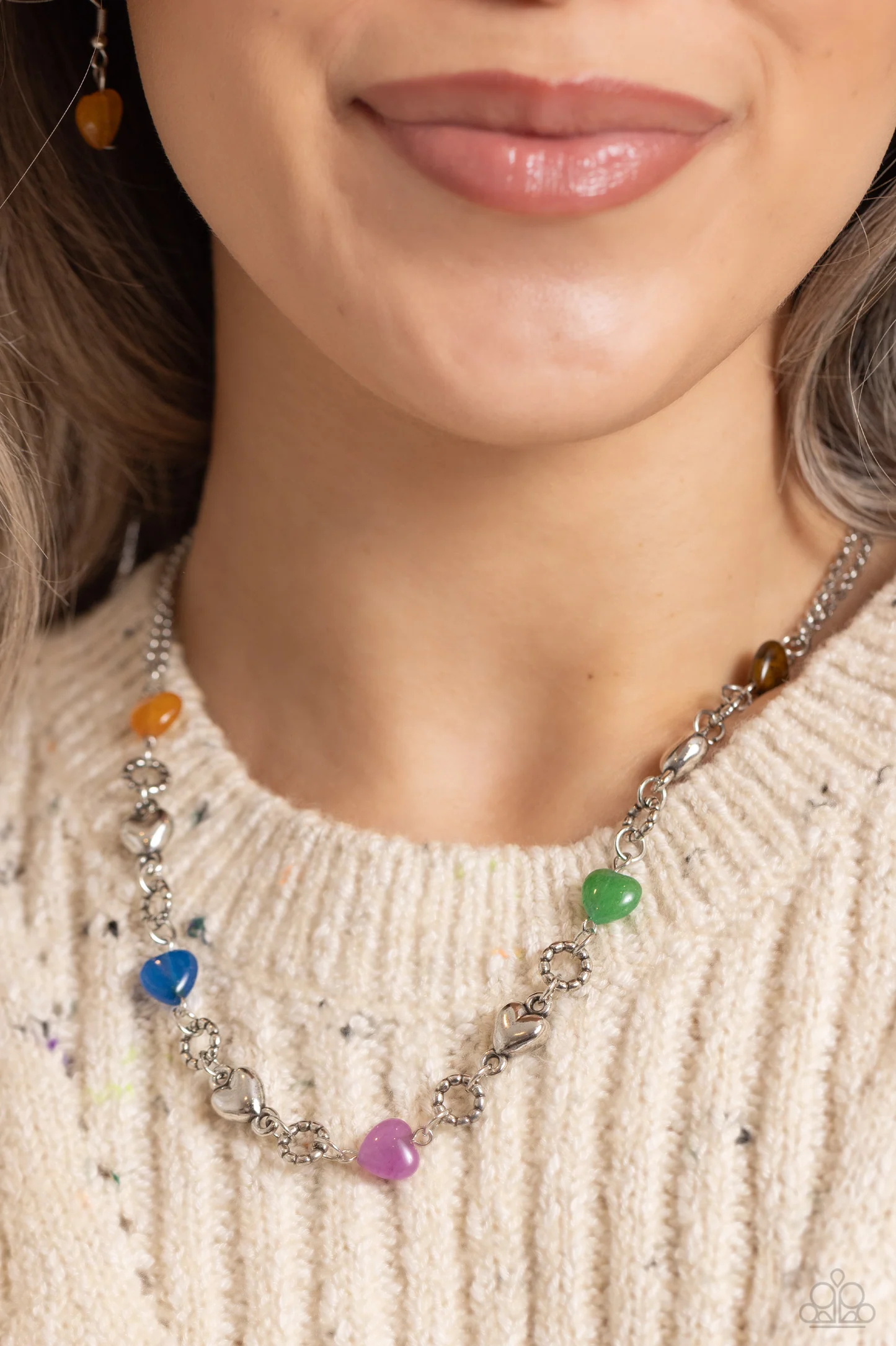 Heart-shaped lapis, jade, amethyst, tiger's eye, and orange stones and sleek silver hearts alternate along the neckline from a double strand of shimmery silver chains. Bubbly textured silver rings separate each heart shape infusing the romantically earthy design with a touch of high-sheen detail. Features an adjustable clasp closure. As the stone elements in this piece are natural, some color variation is normal.