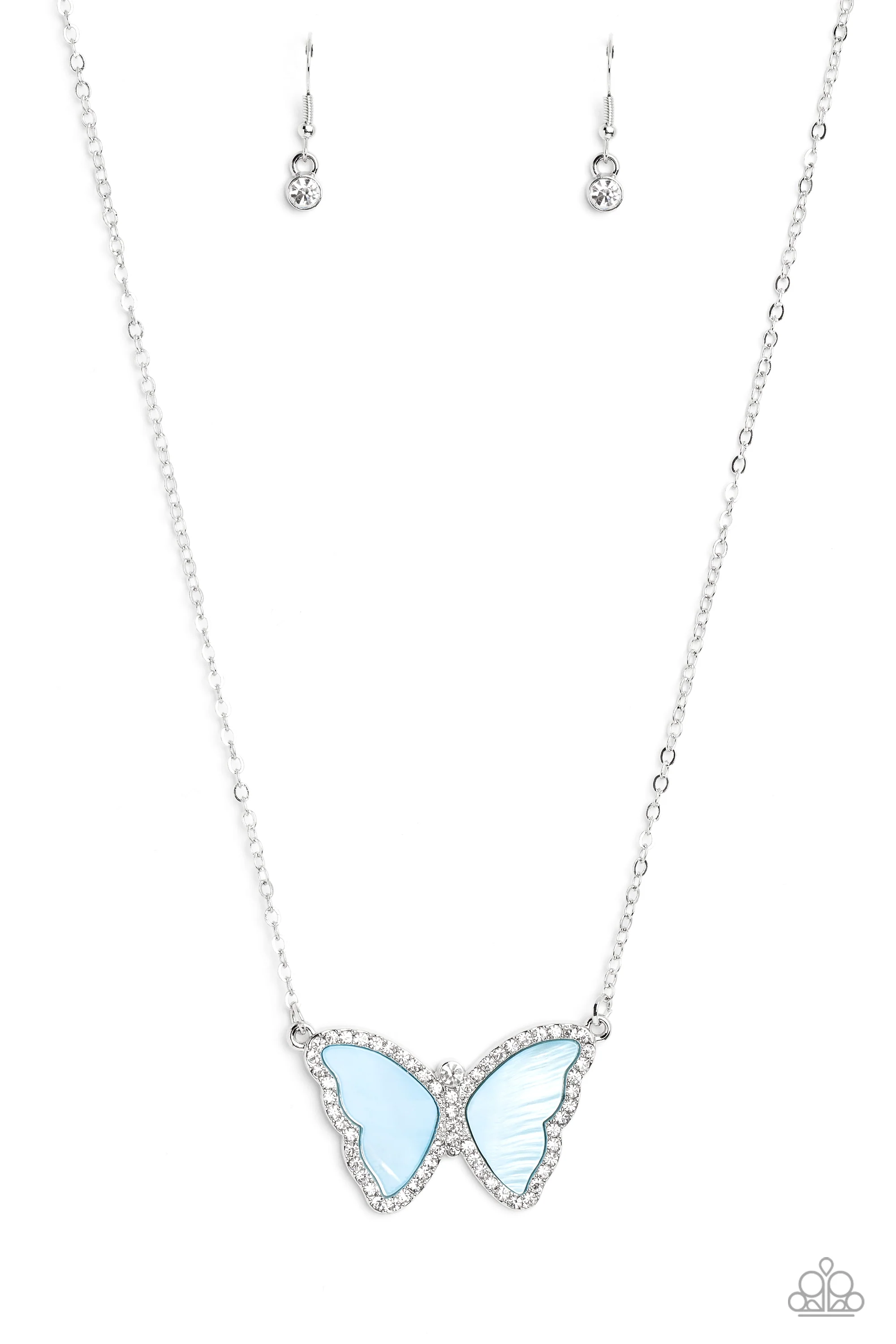 Shimmery Spun Sugar shells are encased inside a silver butterfly frame, creating its wings. Bordering the shell wings and encrusted along the butterfly's body, are white rhinestones that shimmer and shine at the bottom of a shiny, elongated chain, creating a whimsical pendant. Features an adjustable clasp closure.