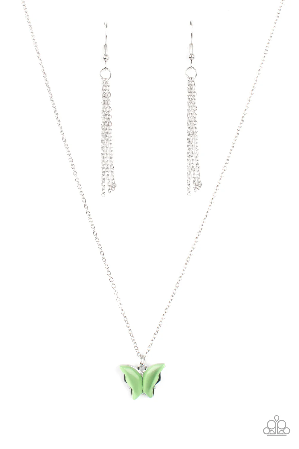 Infused with glistening green cat's eye stone wings, a shiny silver butterfly pendant swings from a dainty silver chain below the collar for a whimsy flair. Features an adjustable clasp closure.