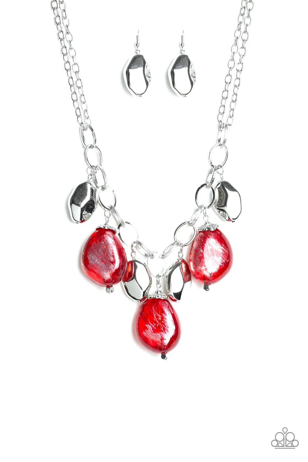 Brushed in a metallic shimmer, oversized glassy red beads and faceted silver beads dangle from the bottom of an oversized silver chain below the collar for a dramatic fringe. Features an adjustable clasp closure.