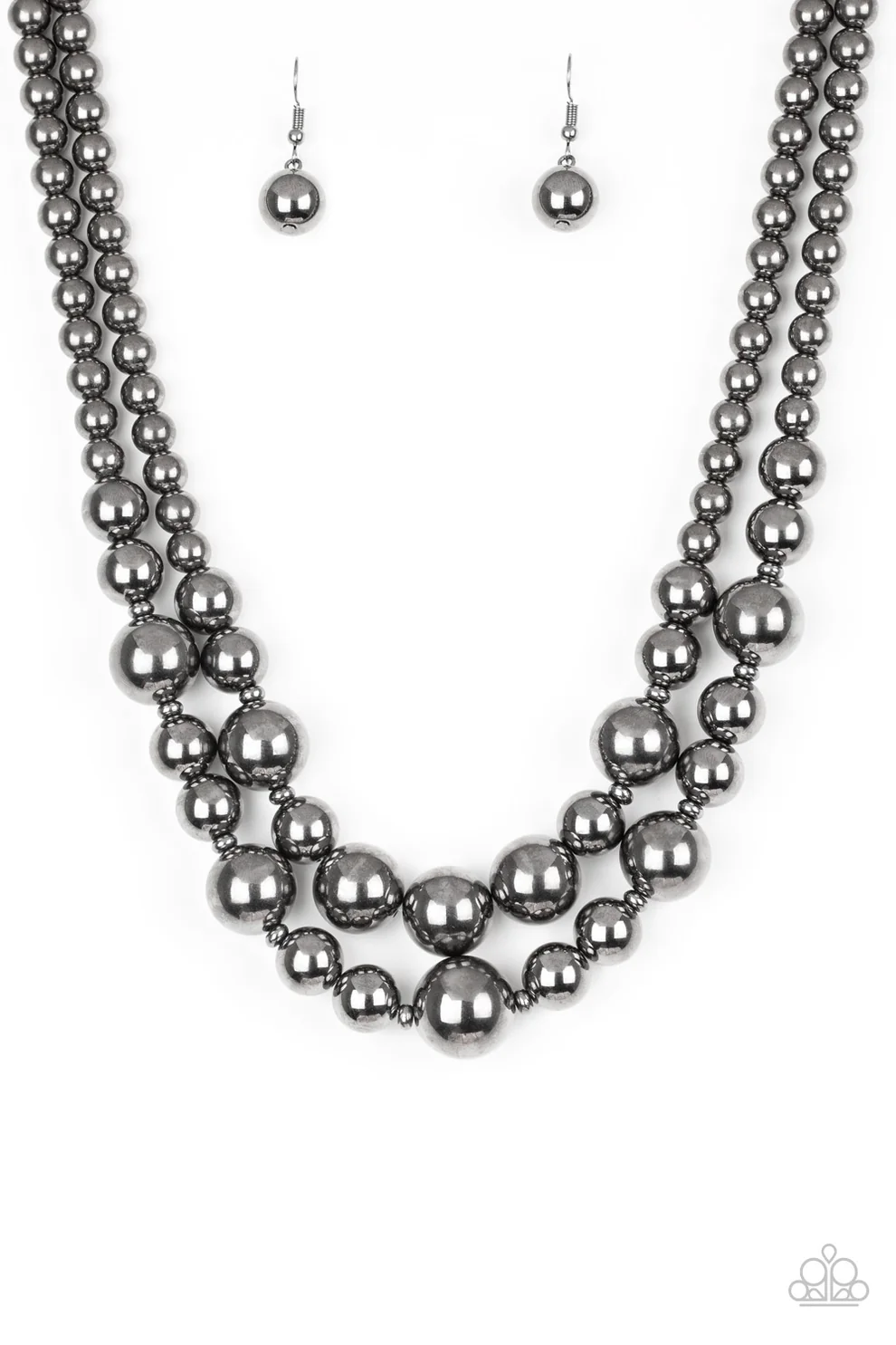 Gradually increasing in size near the center, strands of glistening gunmetal beads with silver beads that are threaded along invisible wires below the collar for a daring look. Features an adjustable clasp closure.