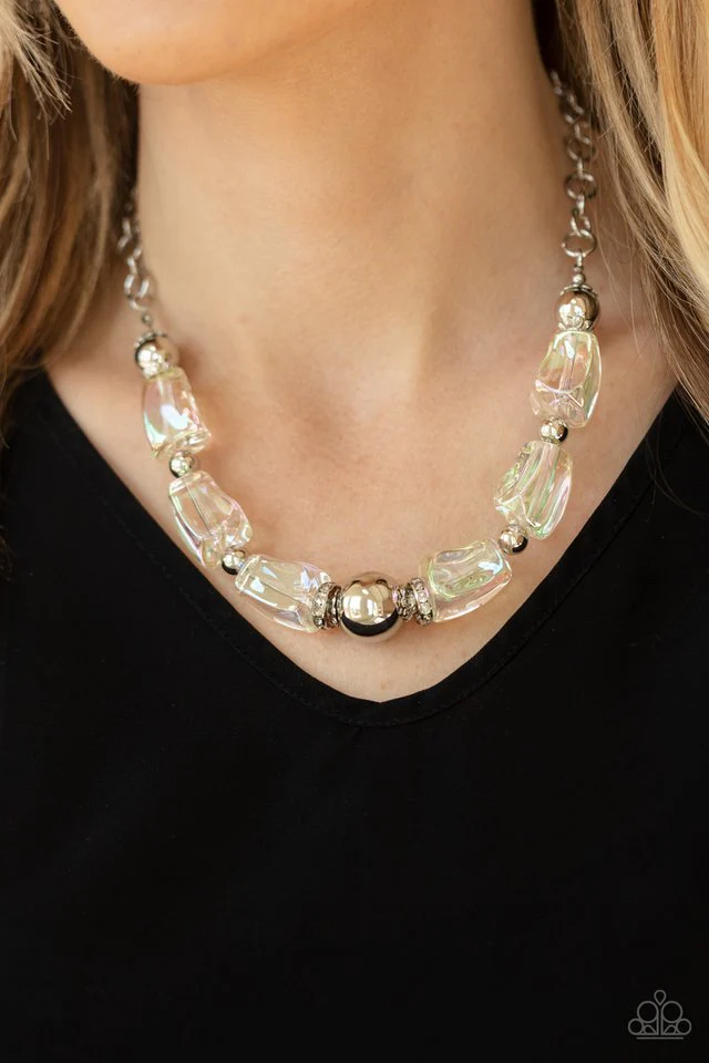 Featuring an icy iridescence, glassy asymmetrical beads joins a mismatched collection of silver beads, white rhinestone encrusted rings, and scalloped silver accents below the collar. Attached to a silver chain, the glacial display catches and reflects light for a statement-making finish. Features an adjustable clasp closure.