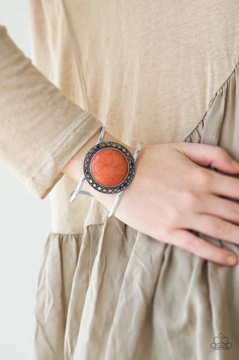 A vivacious orange stone is pressed into the center of a shimmery silver frame radiating with sunburst details. The earthy frame sits atop an airy silver cuff for a seasonal finish. Sold as one individual bracelet.
