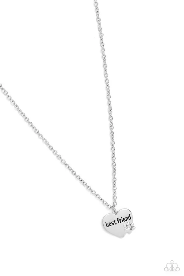 A charming silver heart frame, adorned with a silver paw print, dangles from a delicate silver chain, forming a delightful pet-themed pendant. The center of the pendant showcases the phrase "best friend" in bold black, adding a vibrant touch to this heartfelt design. Complete with an adjustable clasp closure, this piece is perfect for pet lovers who cherish their furry companions.