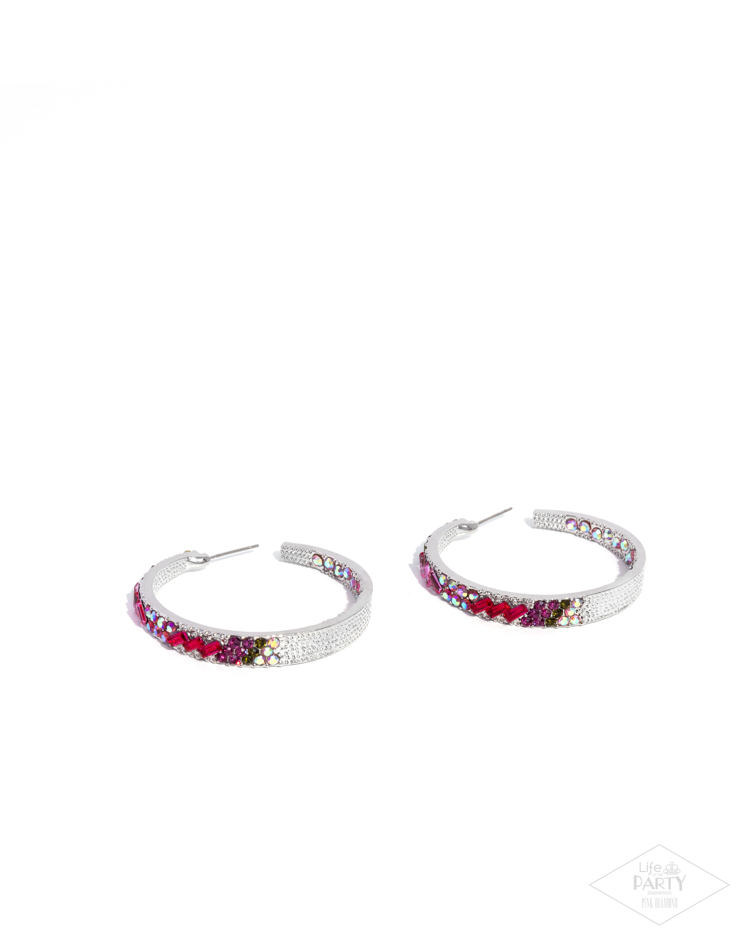 The front facing surface of a chunky silver hoop is dipped in brilliantly sparkling iridescent and multicolored rhinestones while light-catching texture wraps around the back. The interior of the hoop features the opposite pattern, creating the illusion of a full hoop of blinding rhinestones. Earring attaches to a standard post fitting. Hoop measures 1 3/4" in diameter. Due to its prismatic palette, color may vary.