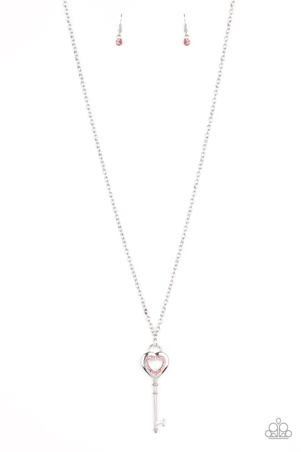 Encrusted in dainty pink rhinestones, a heart-shaped silver key pendant swings from the bottom of a lengthened silver chain for a flirty look. Features an adjustable clasp closure.