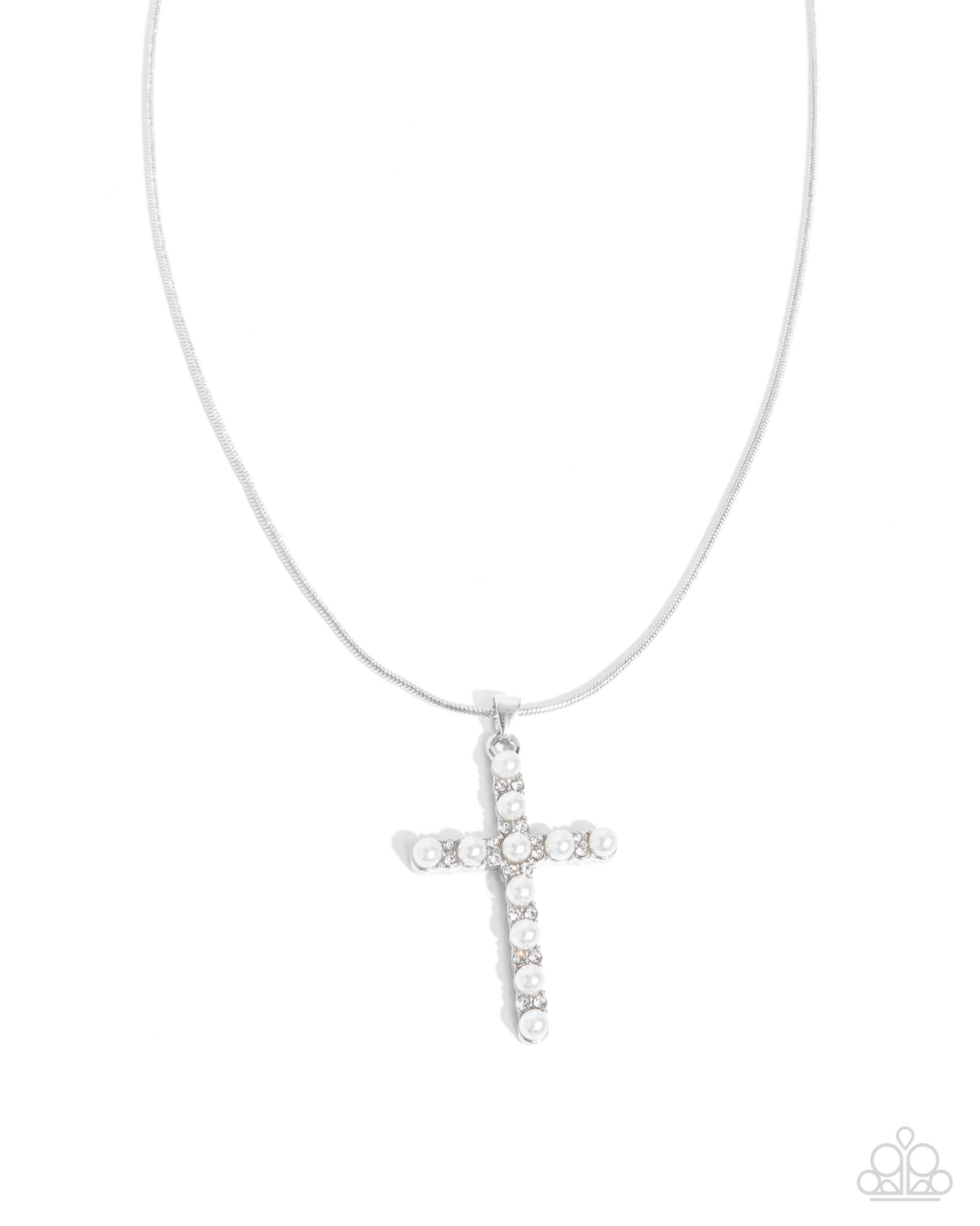 A delicate silver snake chain showcases a cross pendant embellished with alternating white pearl accents and sparkling rhinestones. The combination of refined pearls and shimmering details creates a timeless and elegant design. Features an adjustable clasp closure.