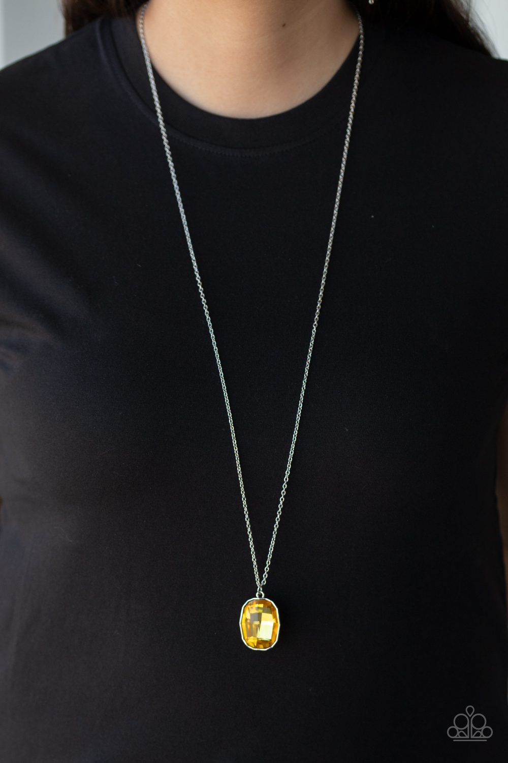 An imperfect yellow gem is pressed into the center of an edgy silver frame at the bottom of a lengthened silver chain for a glitzy look. Features an adjustable clasp closure.