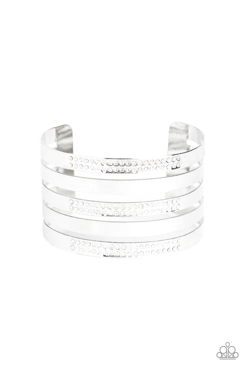 Smooth silver and glittery white rhinestone encrusted silver bands alternate across the wrist, stacking into a statement-making cuff.