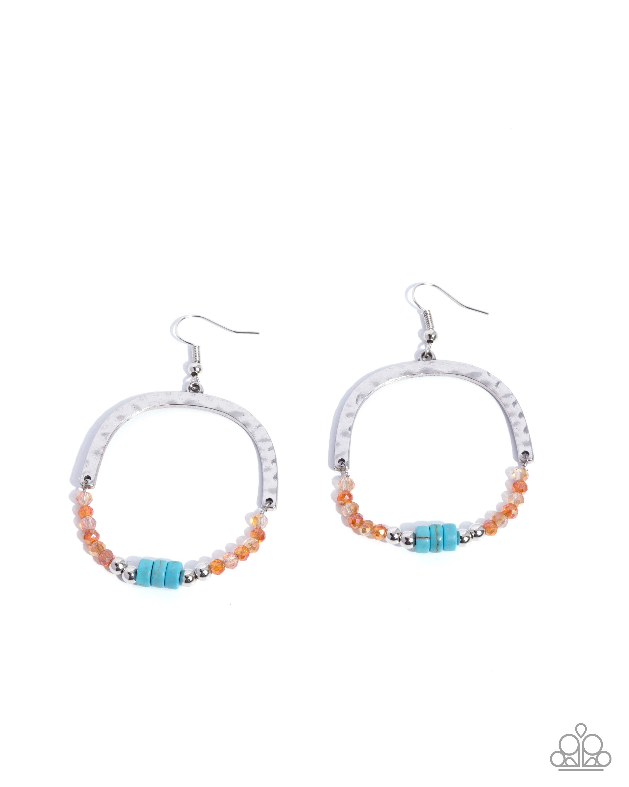 Infused with orange UV-shimmery beads, silver beads, and a trio of turquoise stone discs, a hammered silver arch sways above the serene collection for a whimsical pop of color. Earring attaches to a standard fishhook fitting. As the stone elements in this piece are natural, some color variation is normal.