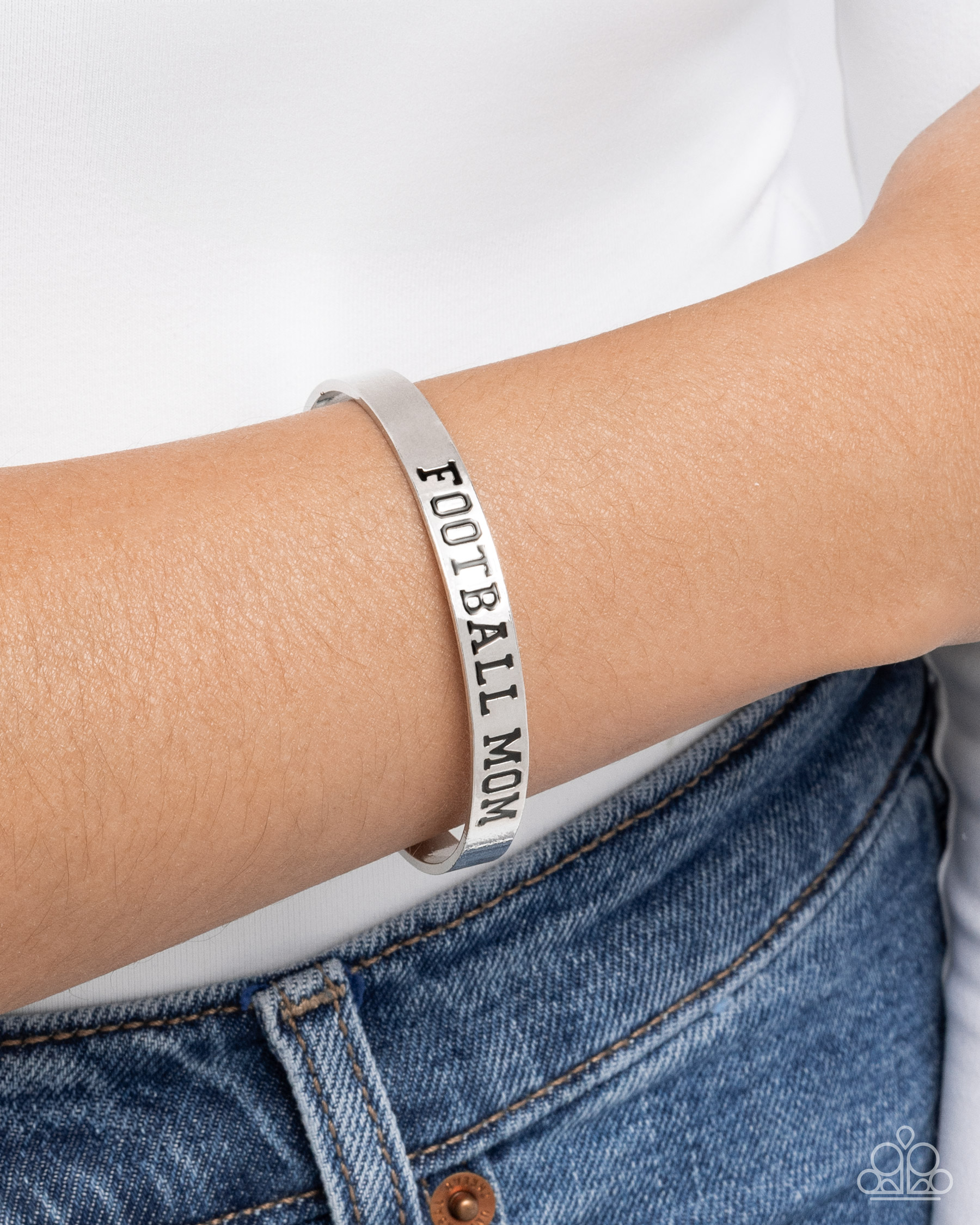 The center of a shiny silver cuff is stamped with the phrase, "Football Mom" in a bold black hue for a sporty-chic look.