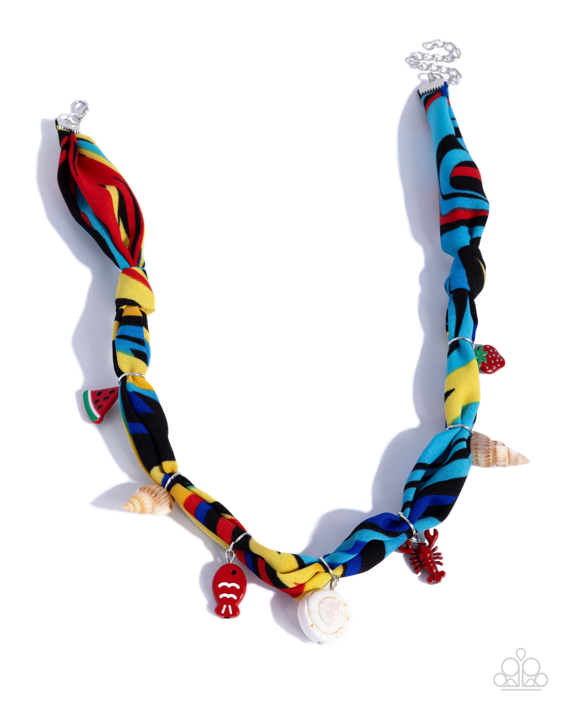 Featuring a multicolored pattern, a vibrant scarf is threaded along the neckline, showcasing a variety of eclectic charms, including a watermelon, seashells, a red fish, a red lobster, and a red strawberry for a coastal, chic display. Features an adjustable clasp closure.