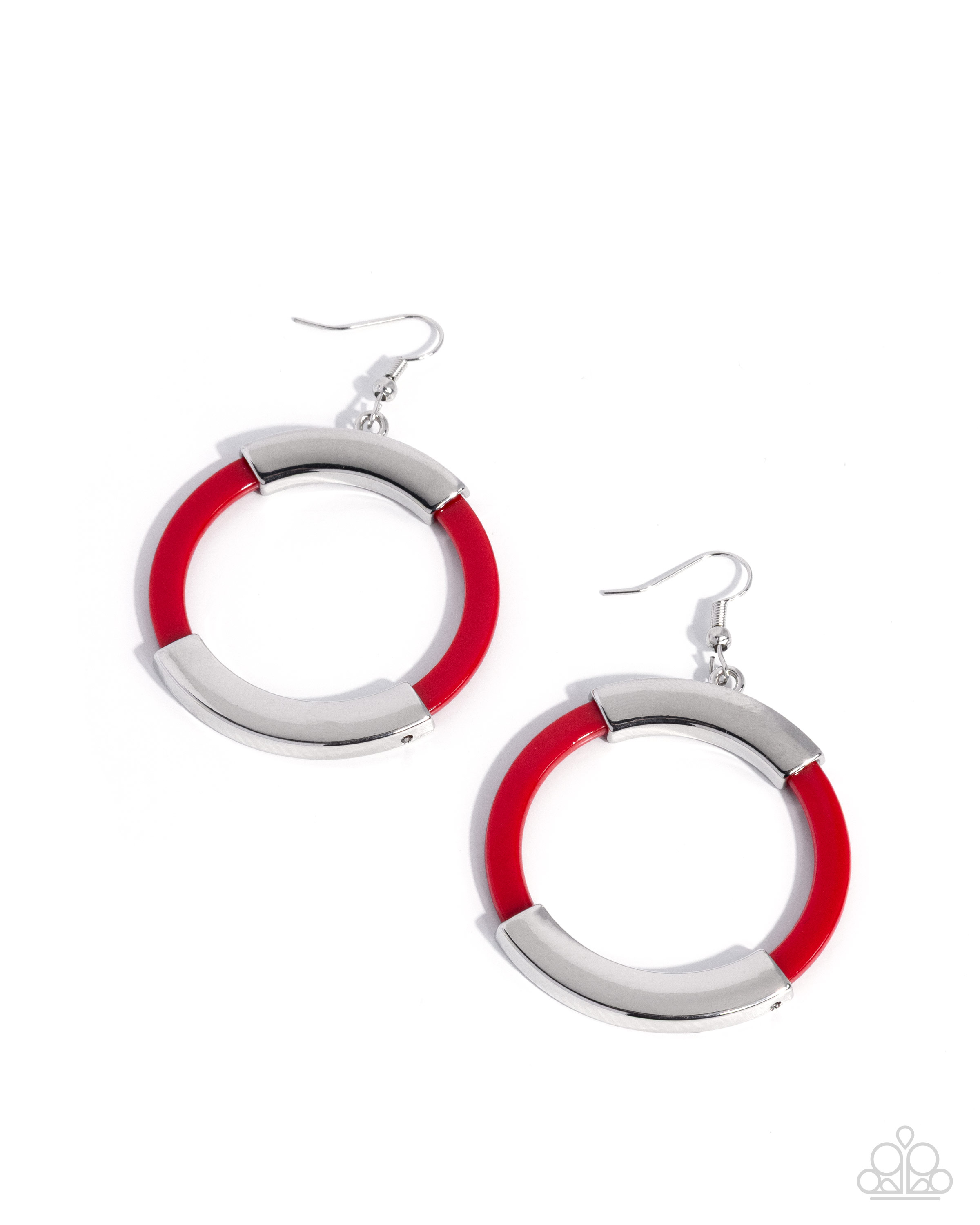 Centered between glistening silver fittings, a red acrylic ring sways below the ear for a feminine, fun-loving lure. Earring attaches to a standard fishhook fitting.