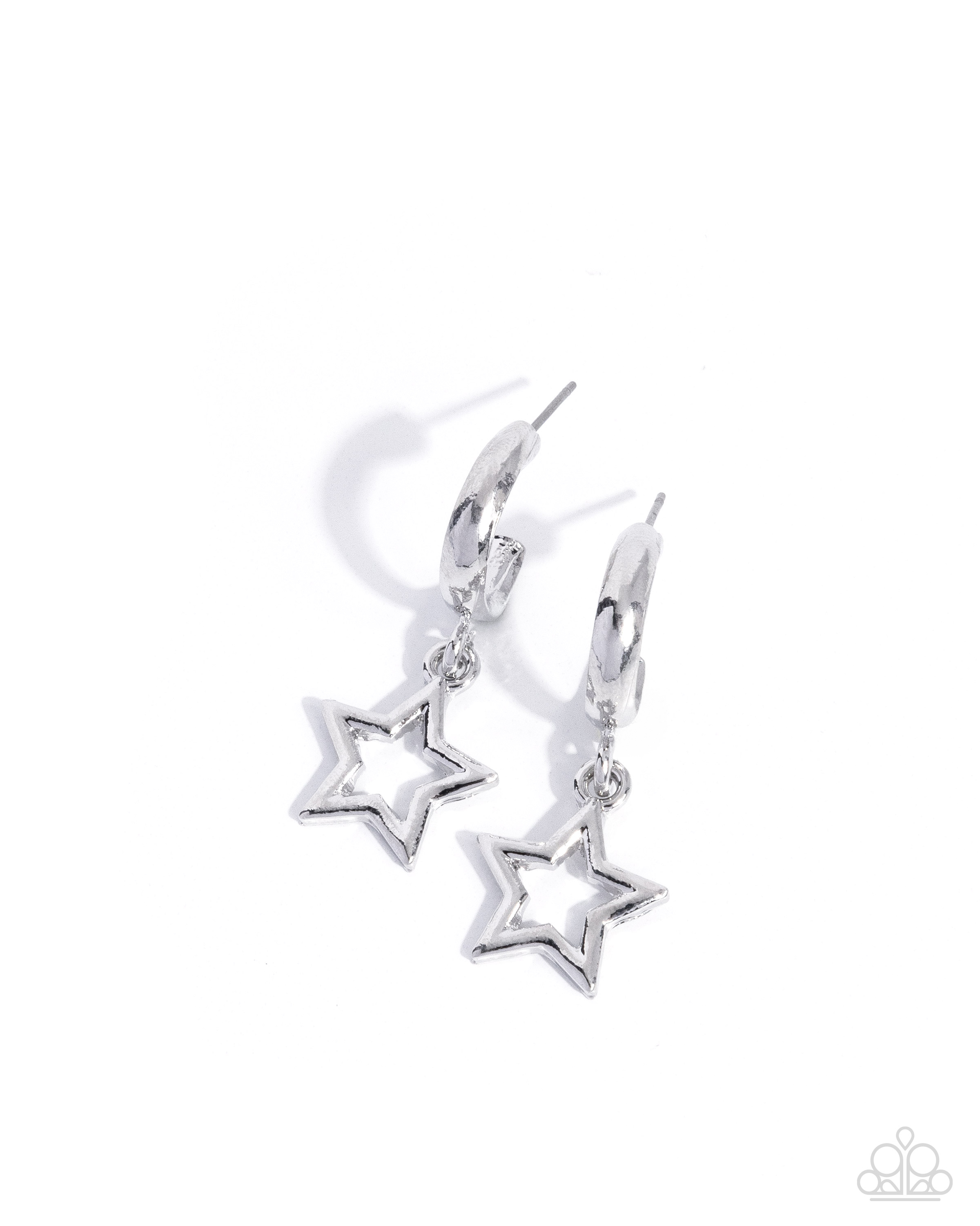 A small, skinny, silver hoop curves around the ear in a timeless fashion, showcasing its suspended silver star silhouette that sways from the center curvature of the hoop, adding a surprising hint of cosmic movement. Earring attaches to a standard post fitting. Hoop measures approximately 1/2" in diameter.