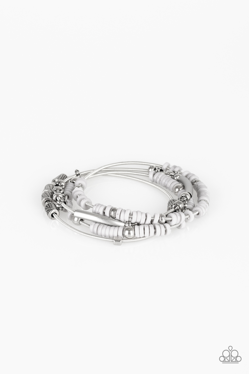 Mismatched silver accents and disc shaped gray beading slides along stretchy spring-like wires for a spunky tribal look.