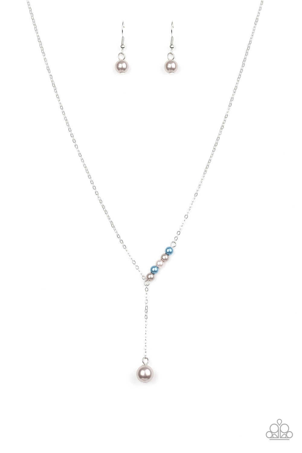 A solitaire silver pearl swings from the bottom of a glistening silver chain, creating a timeless extended pendant below the collar. A section of dainty silver and blue pearls dot one side of the chain for a refined asymmetrical finish. Features an adjustable clasp closure.