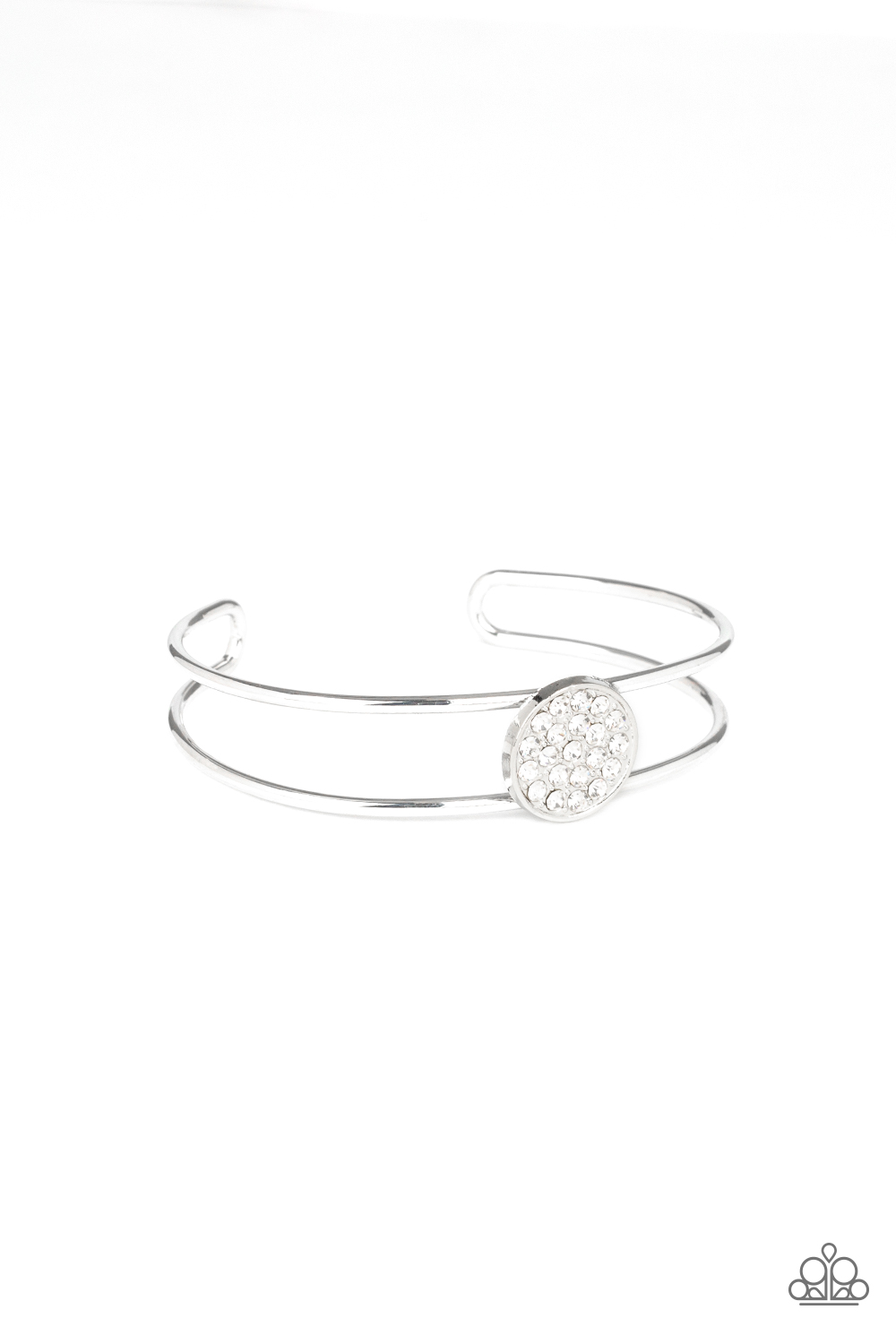 Glittery white rhinestones are encrusted along the front of a shimmery silver disc atop the center of a dainty silver cuff for a dazzling look.