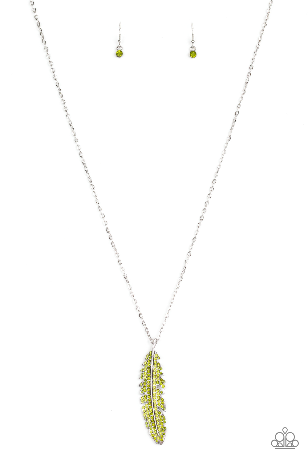 Encrusted in glittery green rhinestones, a lifelike silver feather pendant swings at the bottom of a lengthened silver chain for a wanderlust sparkle. Features an adjustable clasp closure.