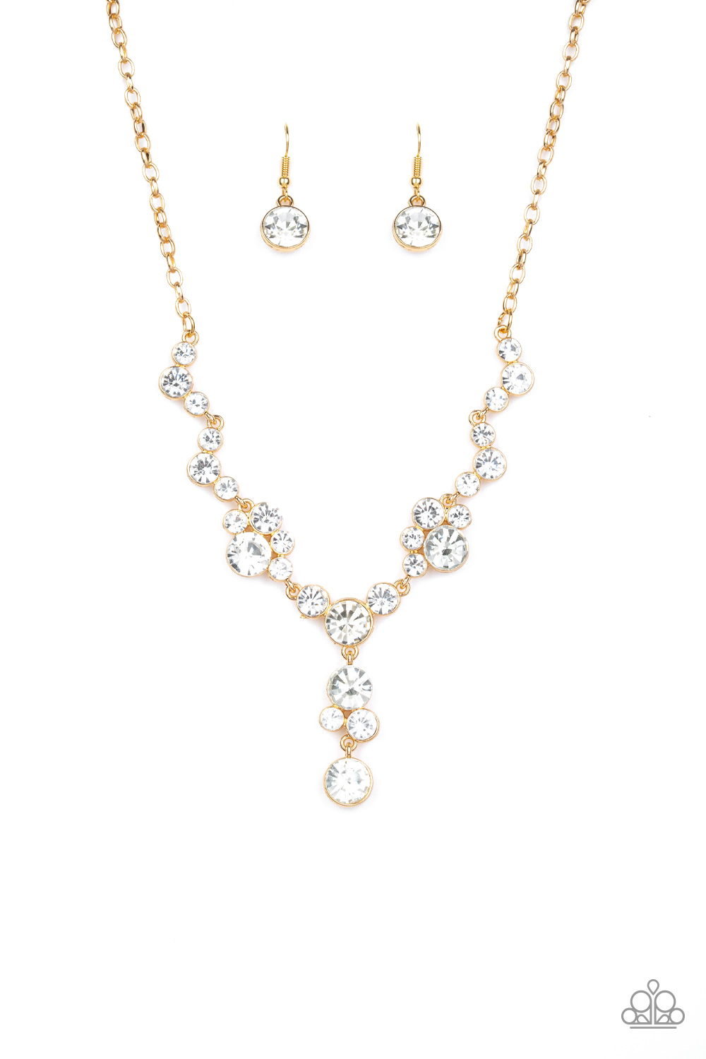 A collection of glassy white rhinestone encrusted frames link below the collar in a timeless fashion. A matching rhinestone encrusted frame and oversized white gem dangle from the bottom, creating a glamorous extended pendant. Features an adjustable clasp closure.