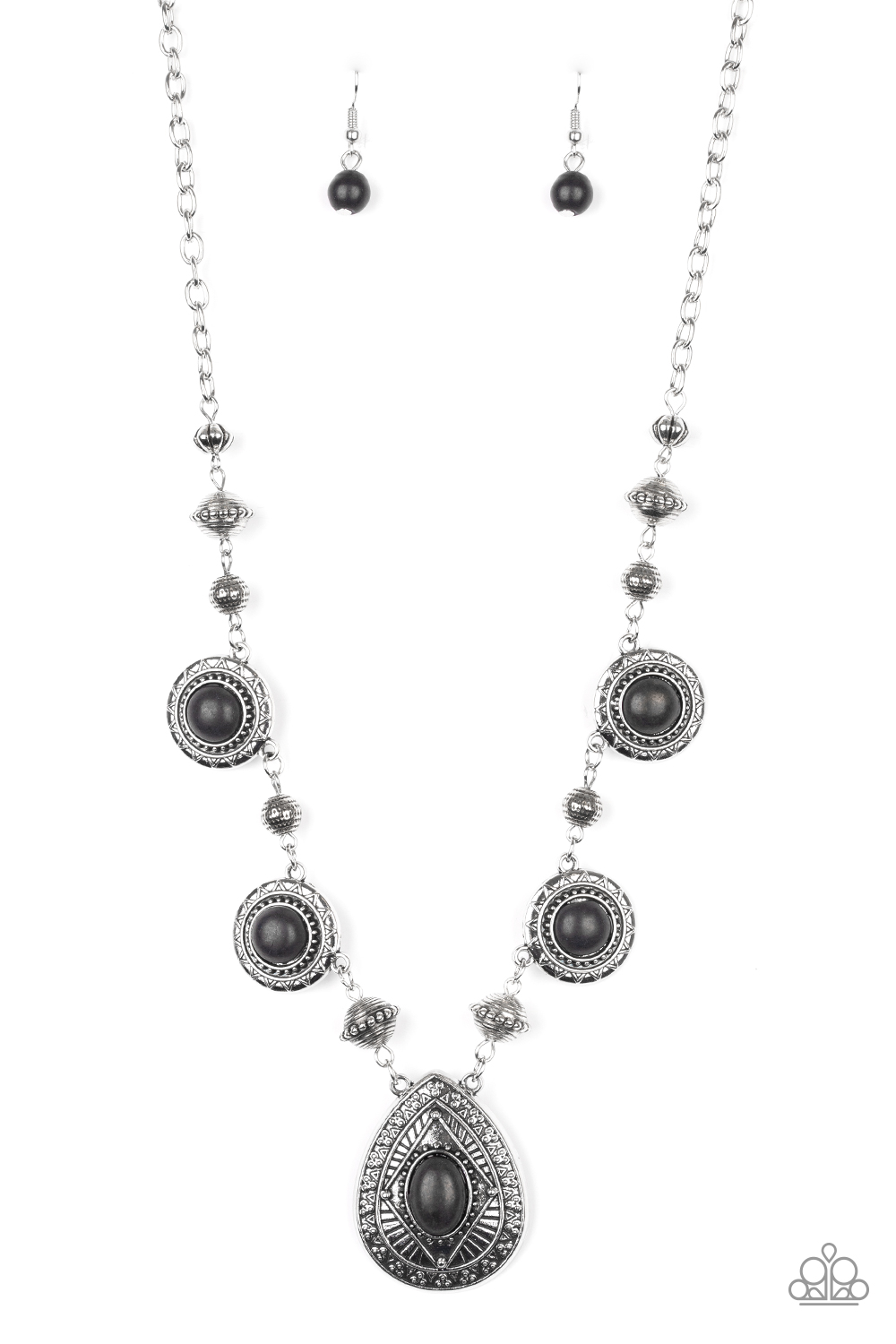 Dotted with round black stones, silver sunburst pattern frames join dainty silver accents along an antiqued silver chain below the collar. Embossed and studded in tribal inspired textures and dotted in a black stone, a silver teardrop pendant swings from the center for a whimsical finish. Features an adjustable clasp closure.