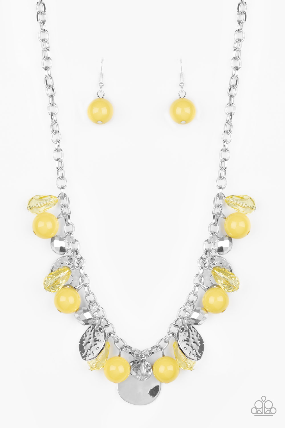 A shimmery collection of hammered silver discs, polished yellow beads, and yellow crystal-like teardrops dangle from the bottom of a silver chain, creating a whimsical fringe below the collar. Features an adjustable clasp closure.