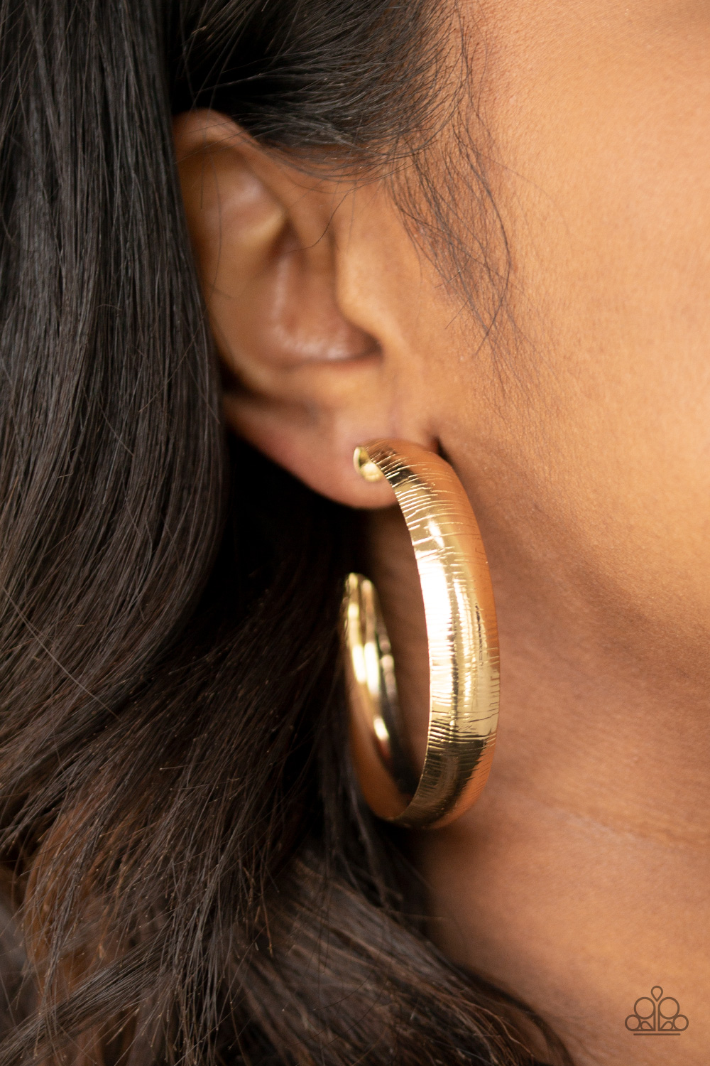 Etched in a shimmery linear pattern, a thick gold hoop curls around the ear for some classic edge. Earring attaches to a standard post fitting. Hoop measures approximately 2" in diameter.