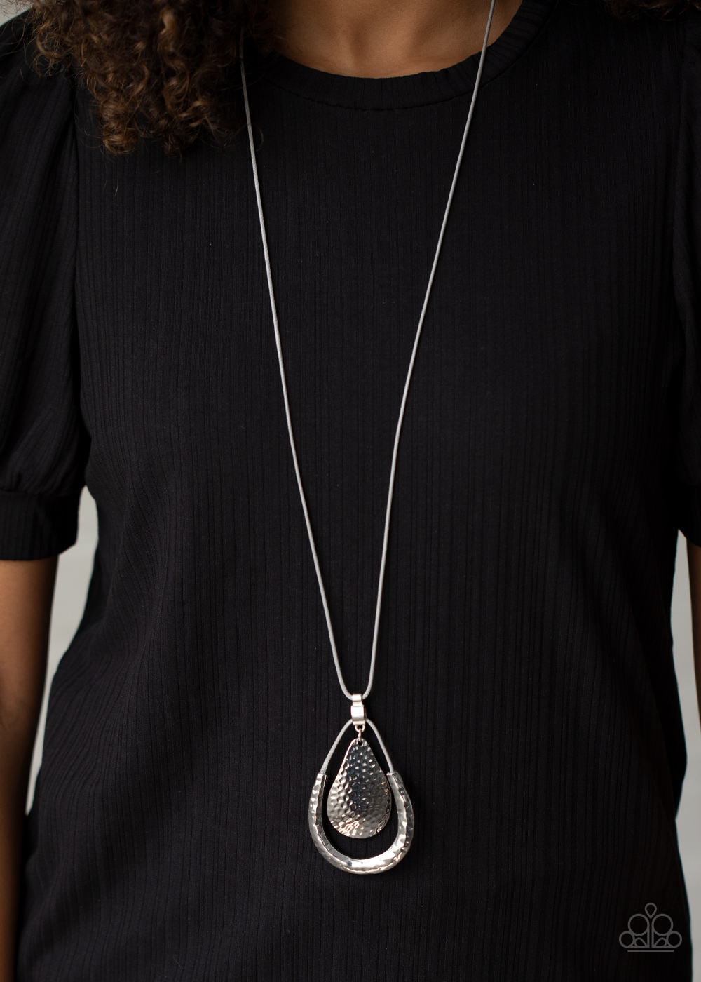 Attached to a shiny silver fitting, a hammered silver teardrop swings from the top of a shiny gray cord pendant featuring a hammered silver accent. The stacked pendants swing from the bottom of a lengthened piece of gray cord for a colorfully trendy look. Features an adjustable clasp closure.