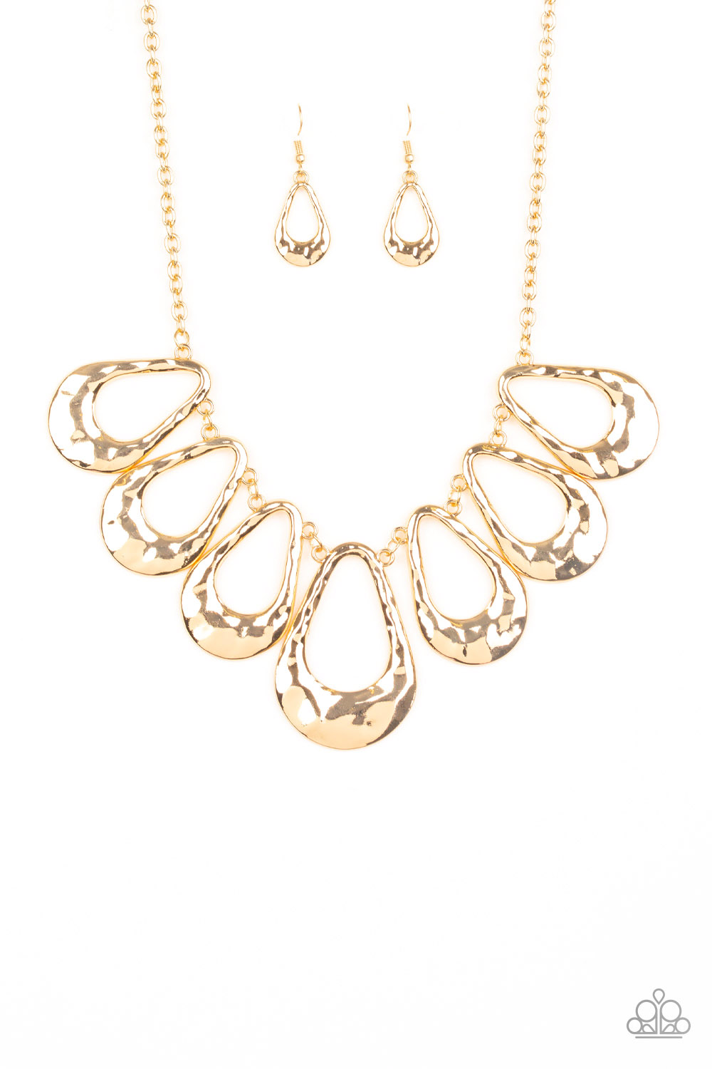 Delicately hammered in shimmer, a collection of shiny gold teardrops link below the collar for an edgy statement-making look. Features an adjustable clasp closure.