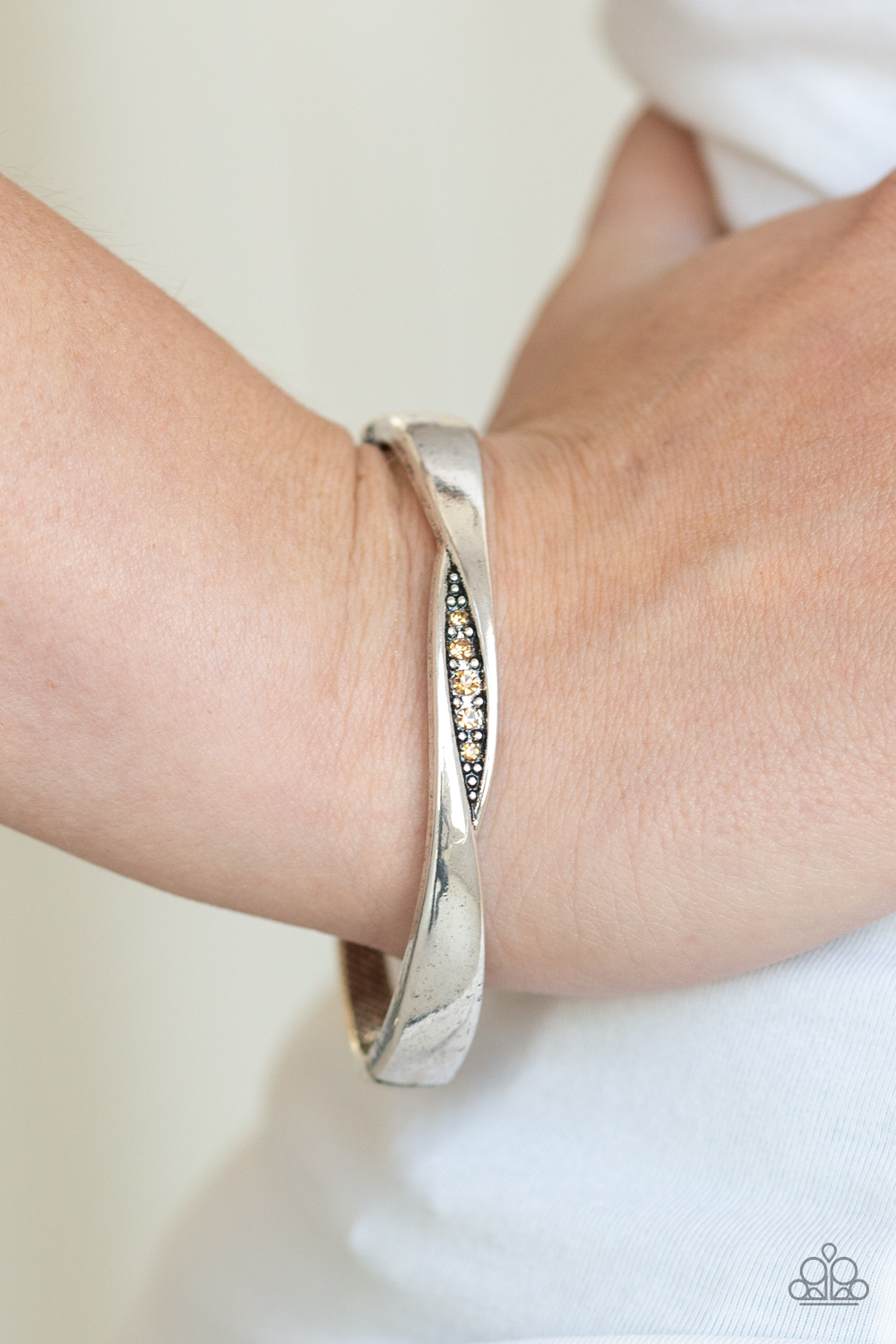 The studded center of a dainty silver bangle-like bracelet is encrusted in a single row of golden topaz rhinestones for a refined finish. Features a hinged closure.