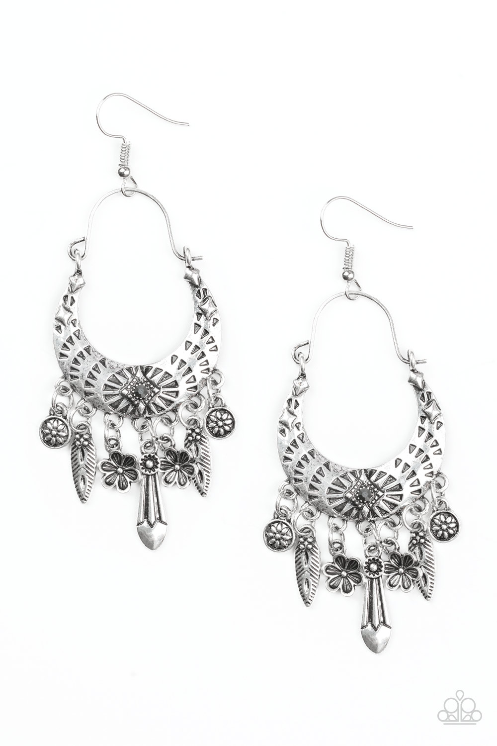 Stamped in triangular textures, a shimmery silver crescent frame gives way to a fringe featuring glistening floral and abstract charms. Suspended by a dainty wire fitting, the tribal inspired frame is dotted with a dainty hematite rhinestone for a sparkling finish. Earring attaches to a standard fishhook fitting.