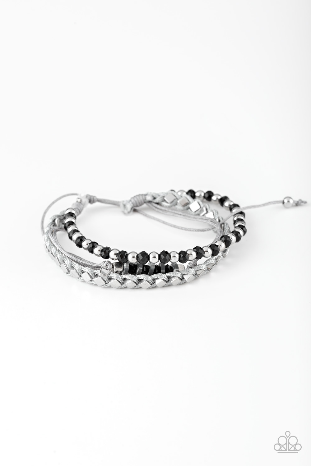 Infused with a strand of faceted black and classic silver beads, shiny gray cording knots around mismatched beads for an edgy look. Features an adjustable sliding knot closure.
