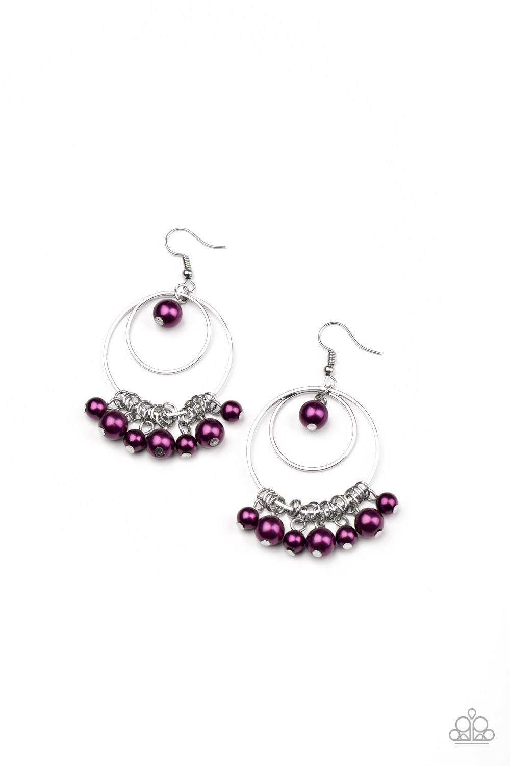 Infused with a bubbly purple pearl fringe, a double hoop frame swings from the ear. A solitaire pearl swings from the top of the joined hoops for a refined finish. Earring attaches to a standard fishhook fitting.