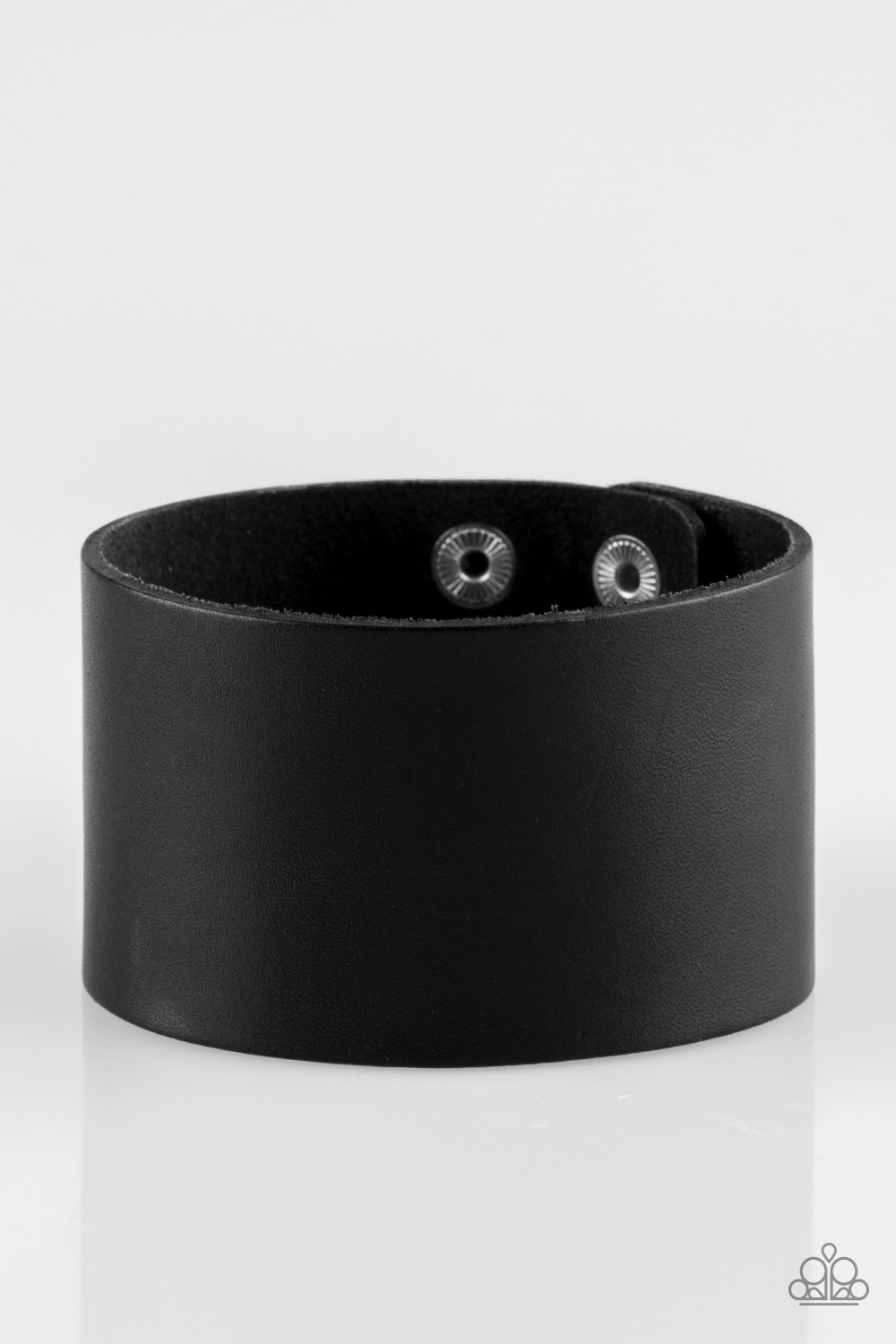 A thick black leather band wraps around the wrist for a bold urban look. Features an adjustable snap closure.