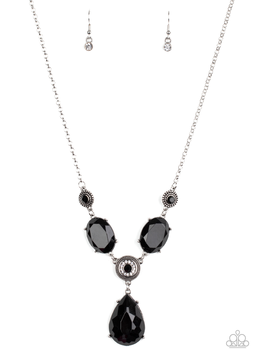 A collection of black and white rhinestone dotted silver frames link with a pair of black oval gems below the collar. A dramatically oversized black teardrop drips from the center, creating a glamorous pendant. Features an adjustable clasp closure.