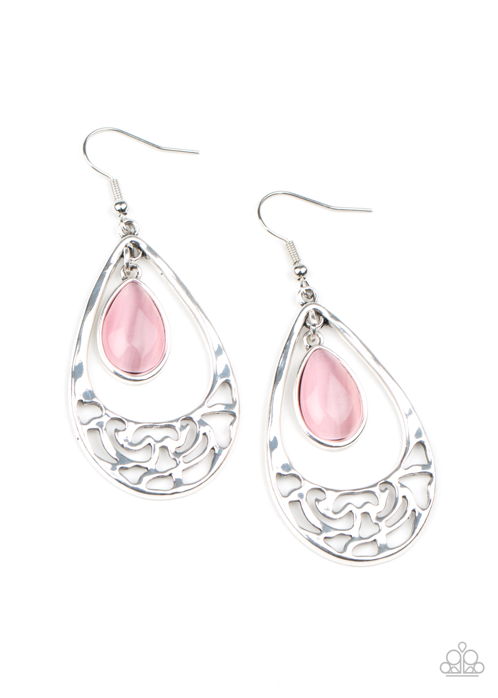 A dewy pink cat's eye teardrop swings from the top of a shimmery silver teardrop frame that features whimsical floral filigree detail. Earring attaches to a standard fishhook fitting.