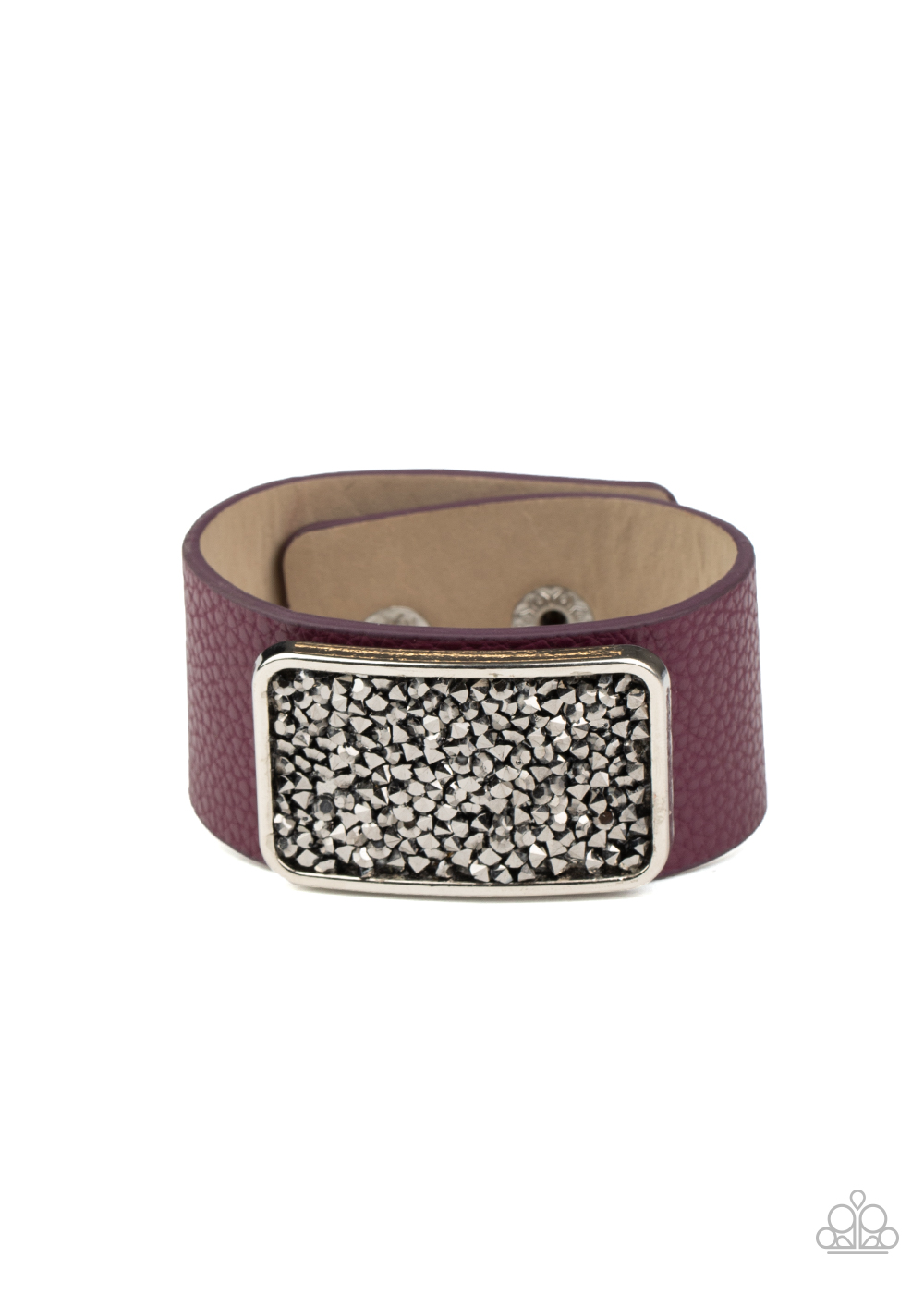 A collision of smoky and hematite rhinestones collect inside a silver rectangular frame that is studded in place in the center of a thick plum leather band, creating a sparkling statement piece around the wrist. Features an adjustable snap closure.