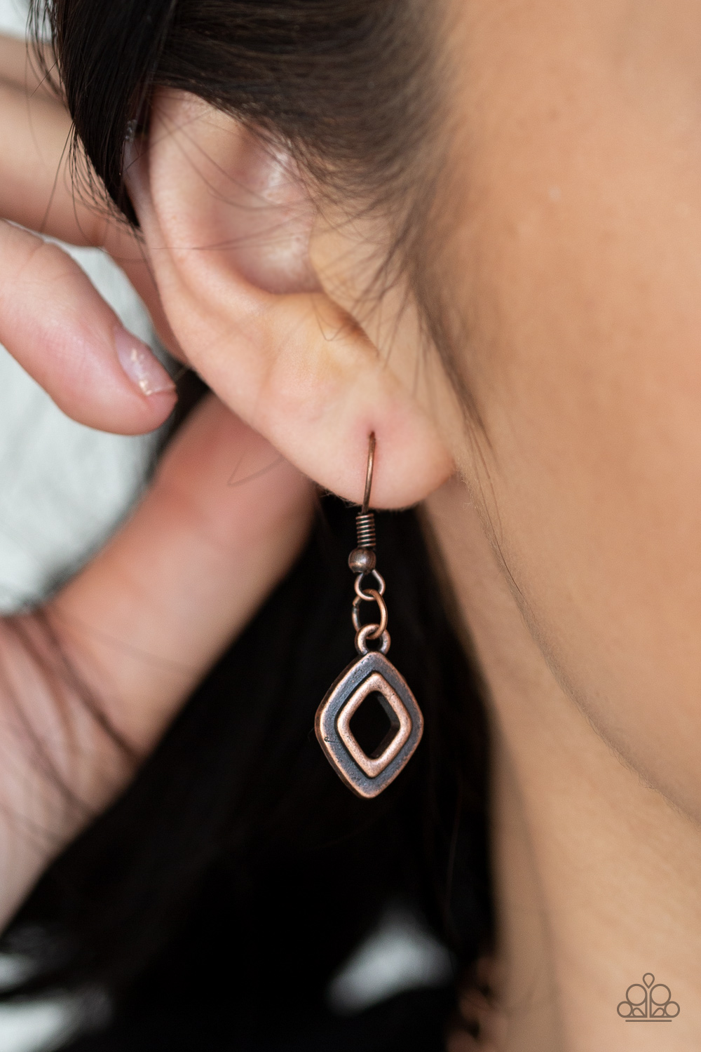 Brushed in an antiqued shimmer, glistening diamond-shaped copper, brass, and silver frames link below the collar, coalescing into an edgy geometric fringe. Features an adjustable clasp closure.
