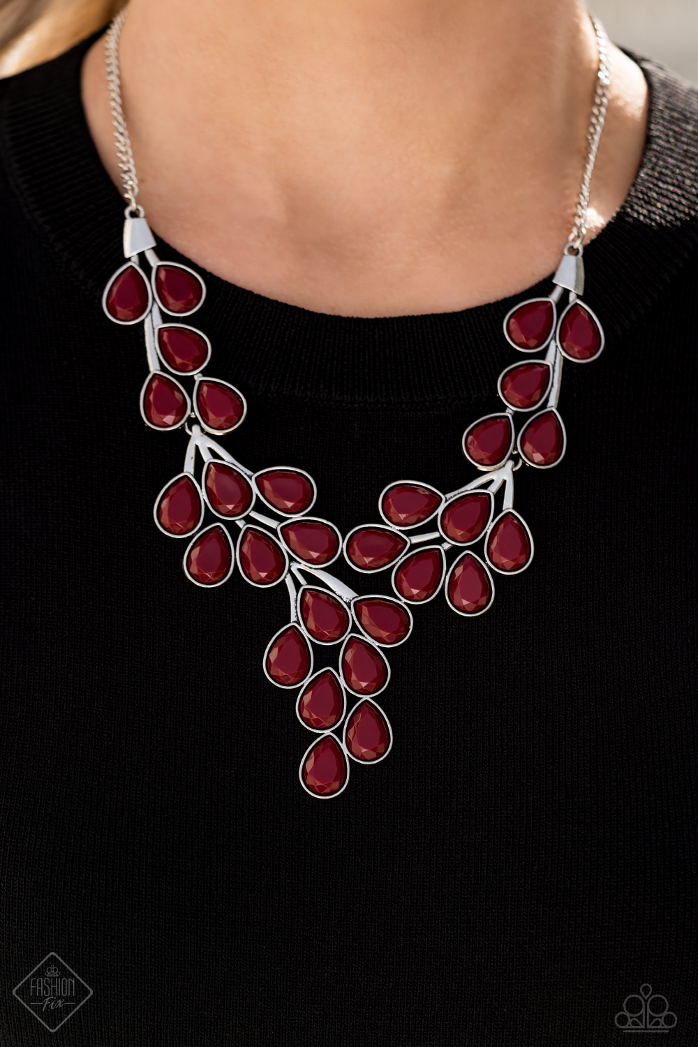 Teardrop shaped beads in the deep, rich shade of Wine are encased in sleek silver frames and clustered together in vine-like patterns. The faceted edges of the beads catch the light as they branch out below the collar, creating a substantial statement piece. Features an adjustable clasp closure.