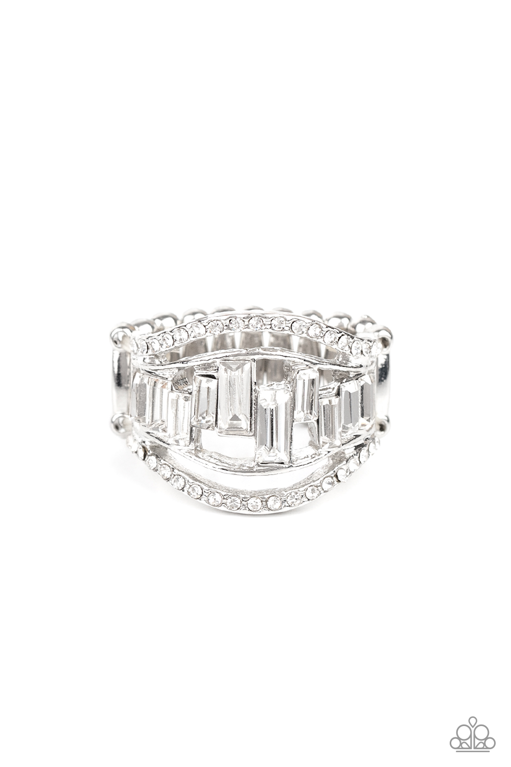 White rhinestone encrusted bands flank a row of emerald cut glass beads in shades of white for a regal look. Features a stretchy band for a flexible fit.