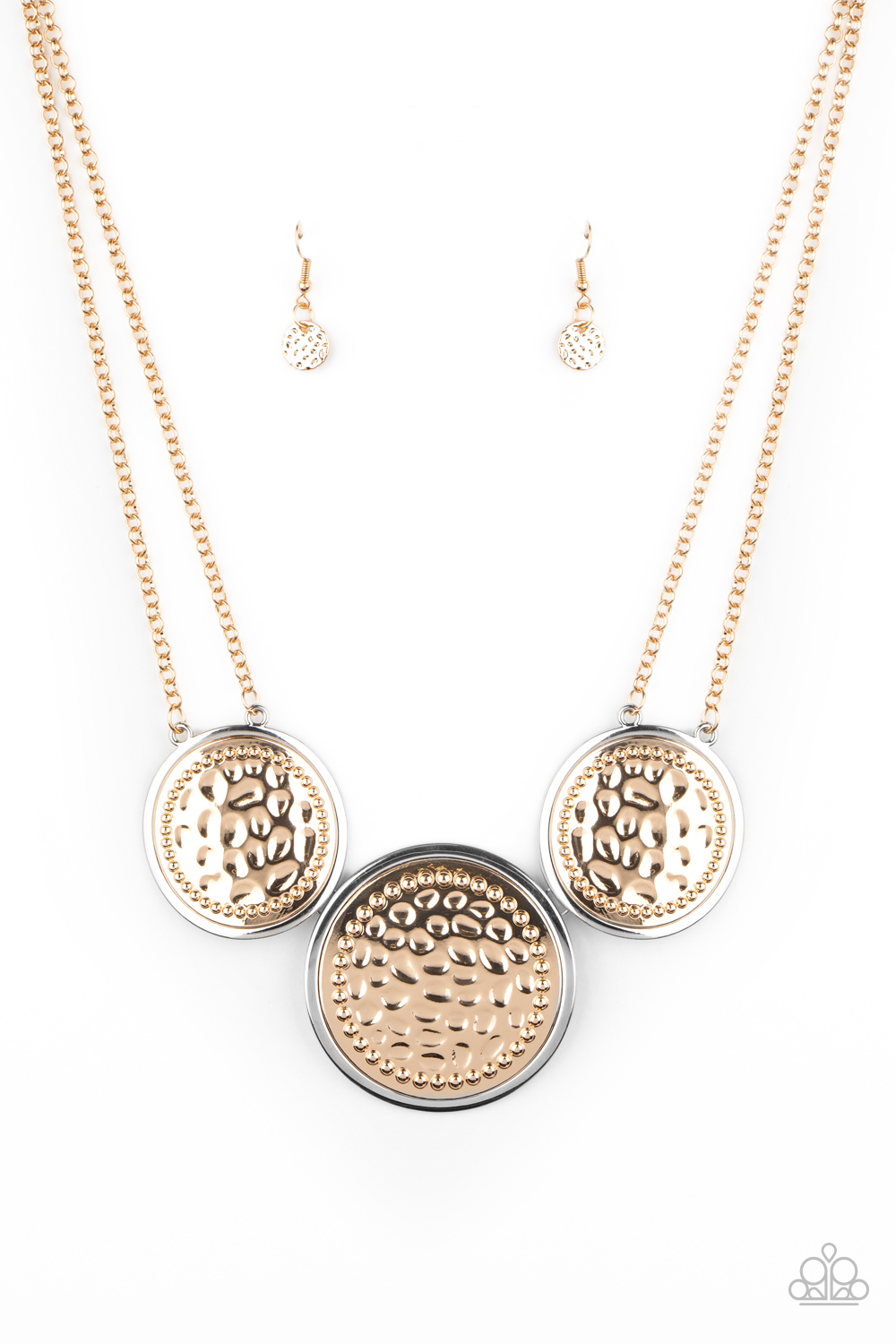 Featuring a warped finish, a trio of hammered and studded silver frames are bordered in gold as they link below the collar for a striking industrial statement. Features an adjustable clasp closure.