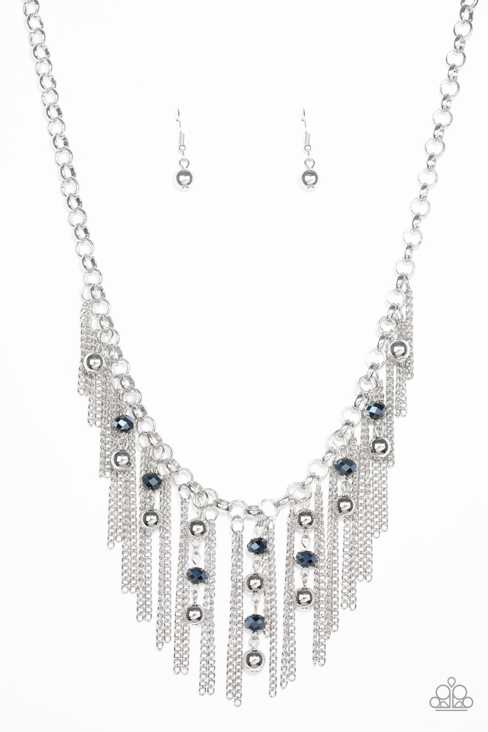 Glistening silver chains and strands of metallic blue crystal-like beads and glistening silver beads stream from the bottom of a bold silver chain, creating a sassy fringe below the collar. Features an adjustable clasp closure.
