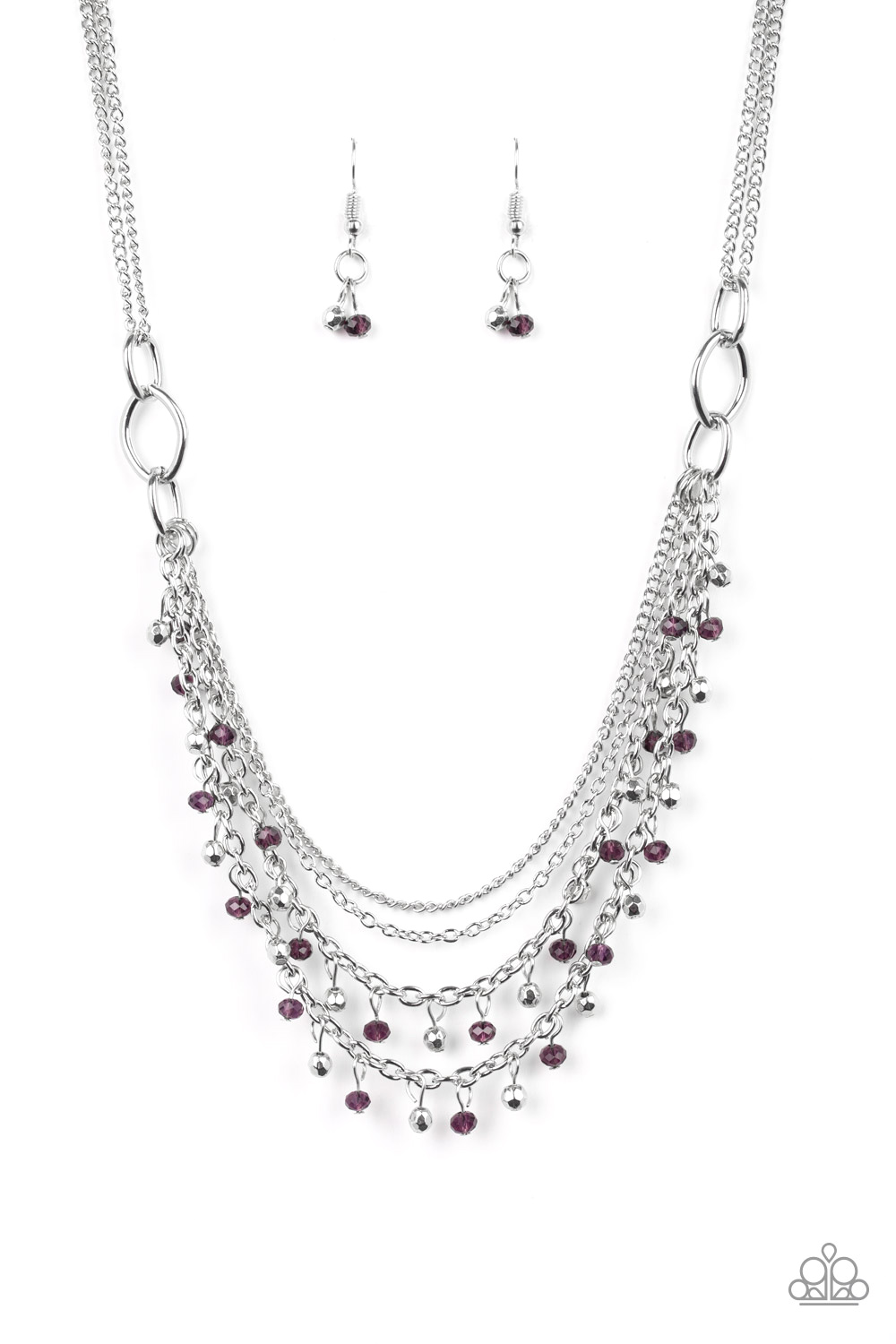 Dainty silver and purple crystal-like beads cascade from two shimmery silver chains. Infused with plain silver chains, the colorful strands layer below the collar for a flirtatious look. Features an adjustable clasp closure.